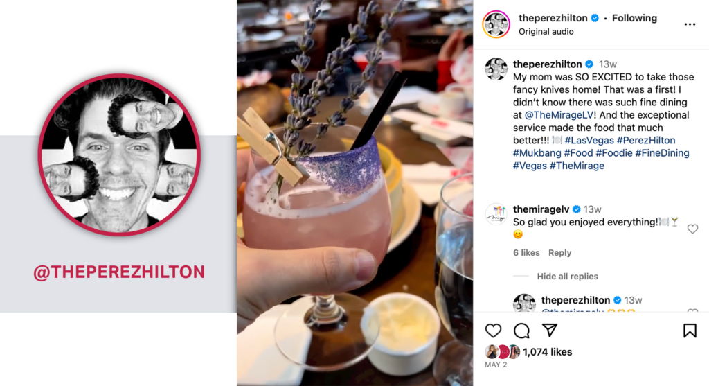 Our team implemented an influencer program to help promote specialty education series and menu offerings for the property. We hosted key influencers and VIPs including Perez Hilton and Sawyer Hemsley to experience what The Mirage offers and spread the word to their fans.