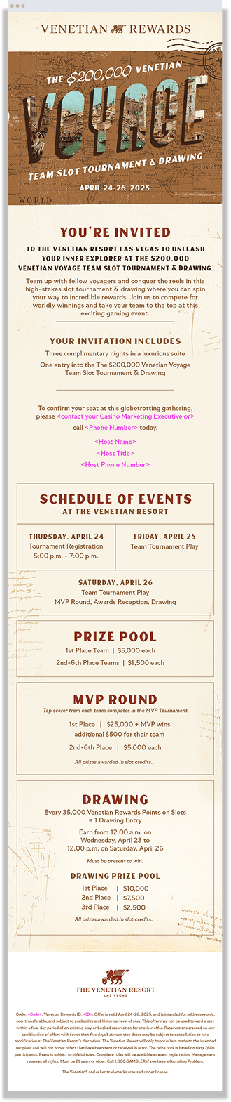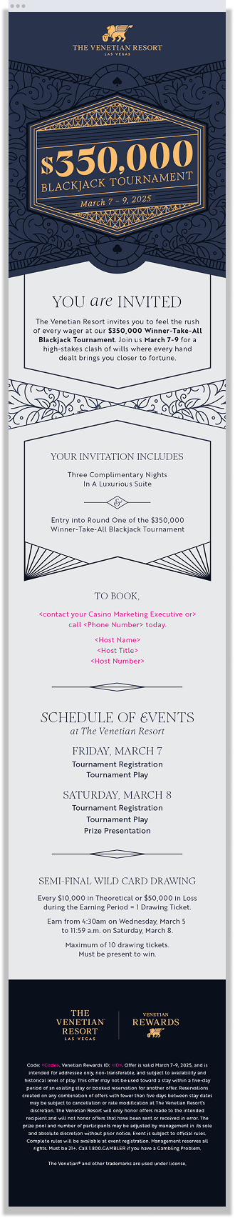 This slot tournament is the Venetian’s most exclusive annual event, celebrating their top players with a luxurious weekend of high-stakes play. We designed a premium invitation featuring gold foil, textured paper, and elegant details.