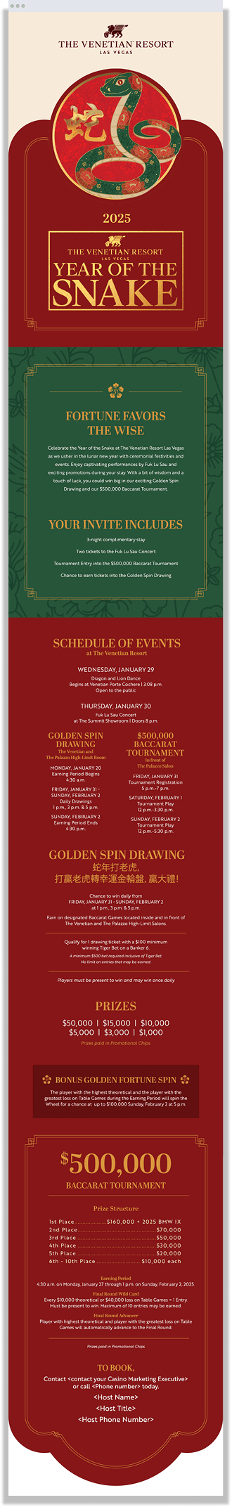 Starting 2025 with the elegant direct mail invitation for Chinese New Year. This exclusive high-stakes Baccarat tournament features symbolic motifs to invite valued Asian gaming guests to join this festive and luxurious celebration.